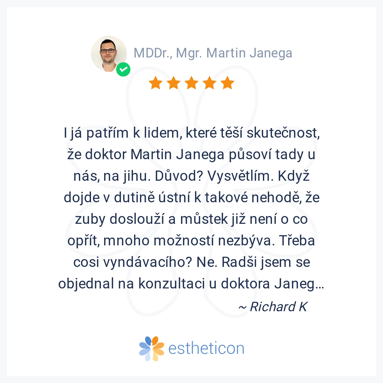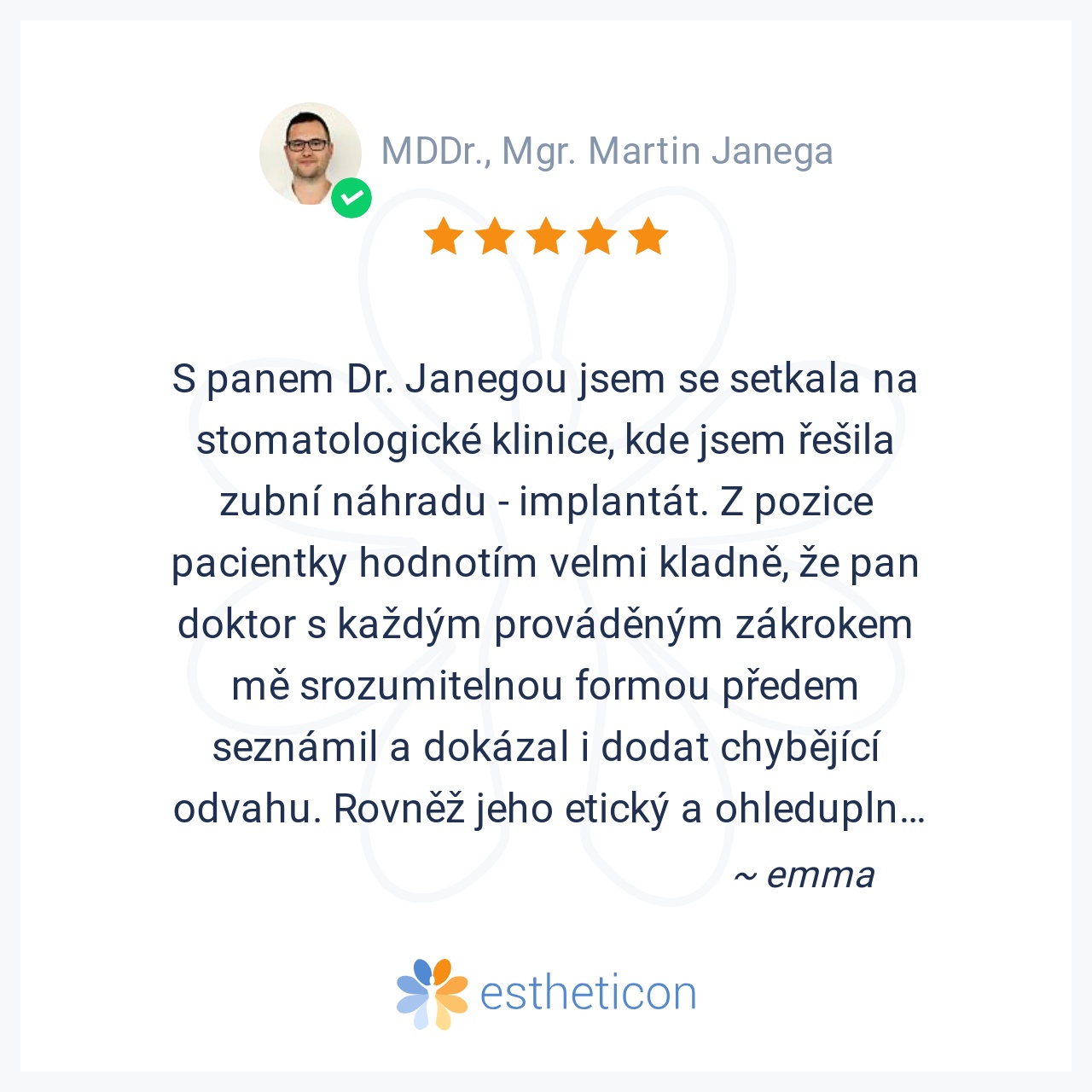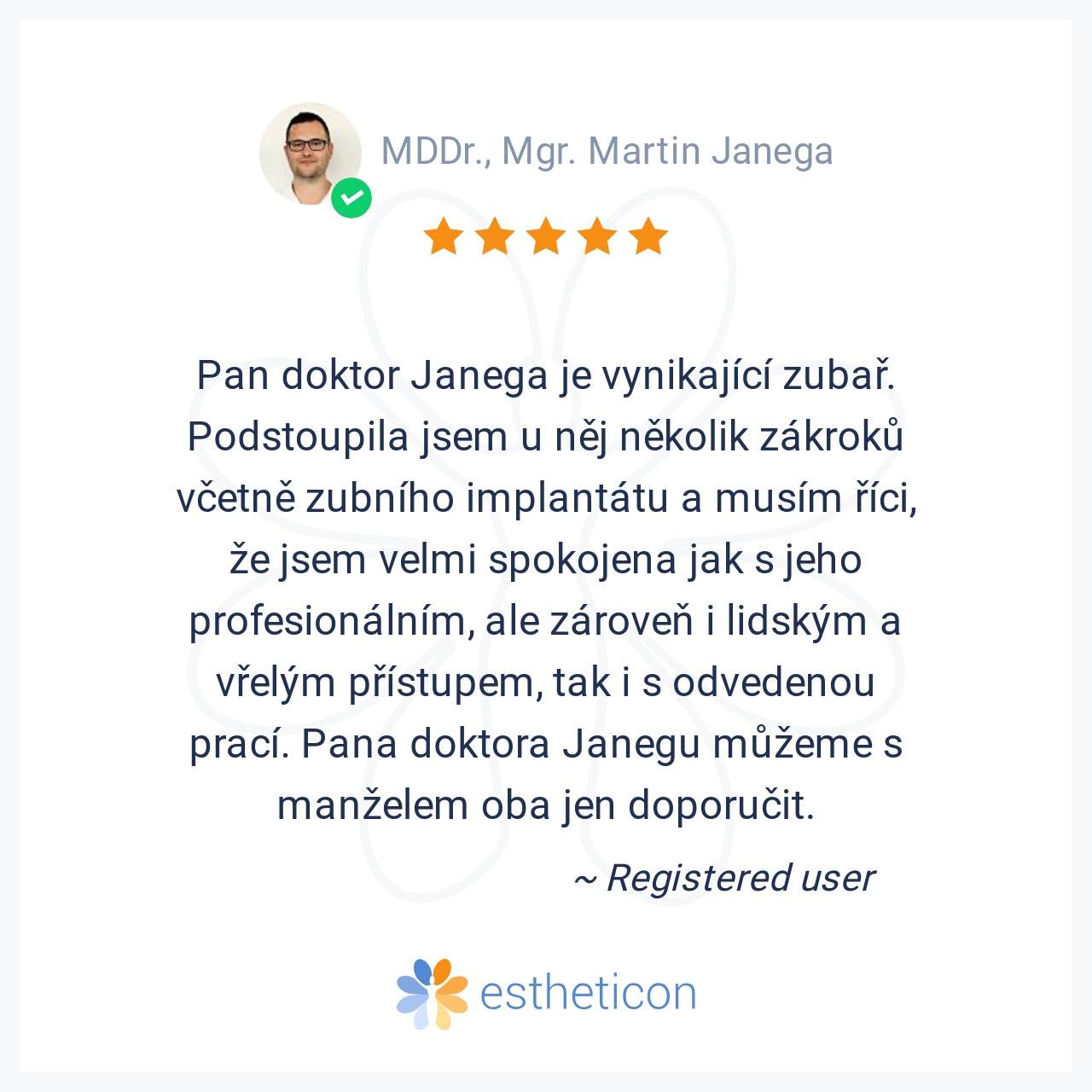 Pan doktor Janega je vynikající zubař. Podstoupila jsem u něj několik zákroků včetně zubního implantátu a musím říci, že jsem velmi spokojena jak s jeho profesionálním, ale zároveň i lidským a vřelým přístupem, tak i s o... Více