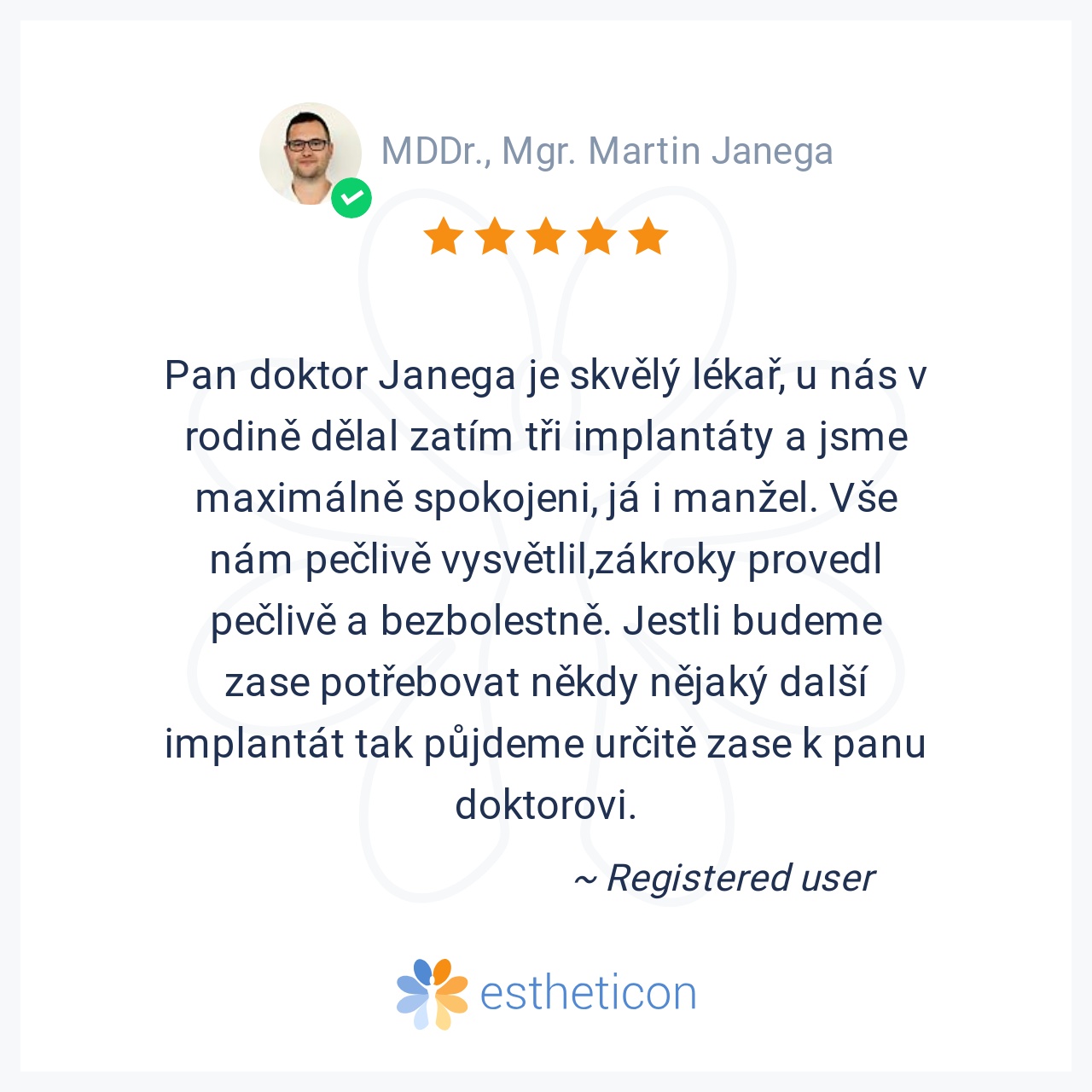 Pan doktor Janega je skvělý lékař, u nás v rodině dělal zatím tři implantáty a jsme maximálně spokojeni, já i manžel. Vše nám pečlivě vysvětlil,zákroky provedl pečlivě a bezbolestně. Jestli budeme zase potřebovat někdy n... Více