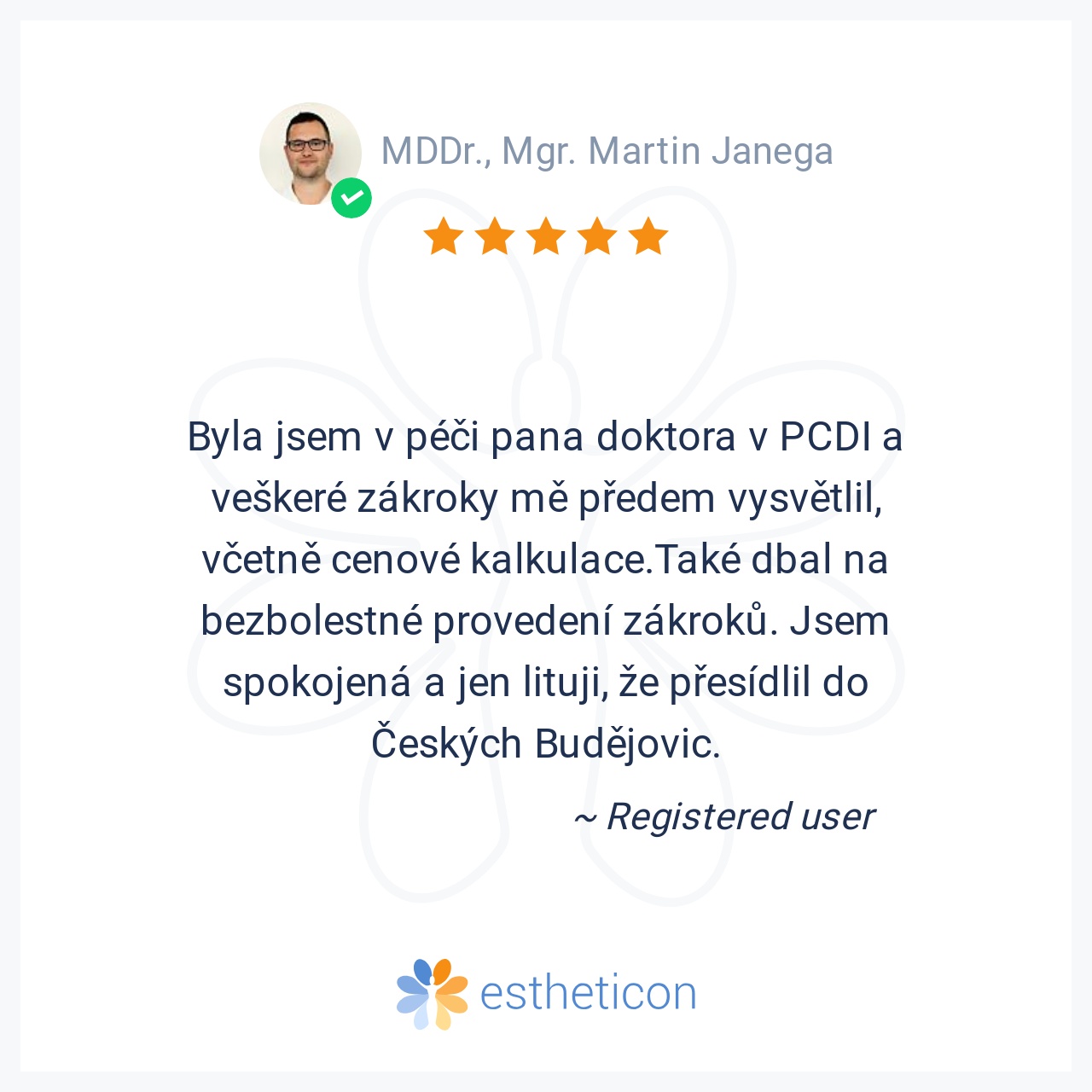 Byla jsem v péči pana doktora v PCDI a veškeré zákroky mě předem vysvětlil, včetně cenové kalkulace.Také dbal na bezbolestné provedení zákroků. Jsem spokojená a jen lituji, že přesídlil do Českých Budějovic.