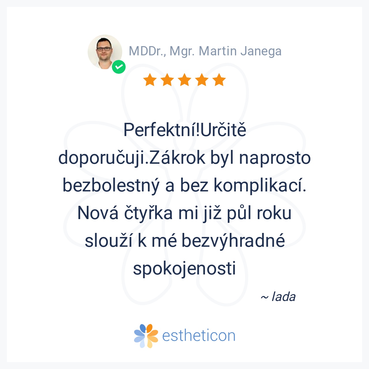 Naprostá spokojenost s implantátem na mém předním horním zubu (jednička vlevo nahoře). Profesionální přístup pana doktora Janegy je podle mne ukázkovým příkladem, jak by měl vypadat profesionál. Perfektní a velice detail... Více