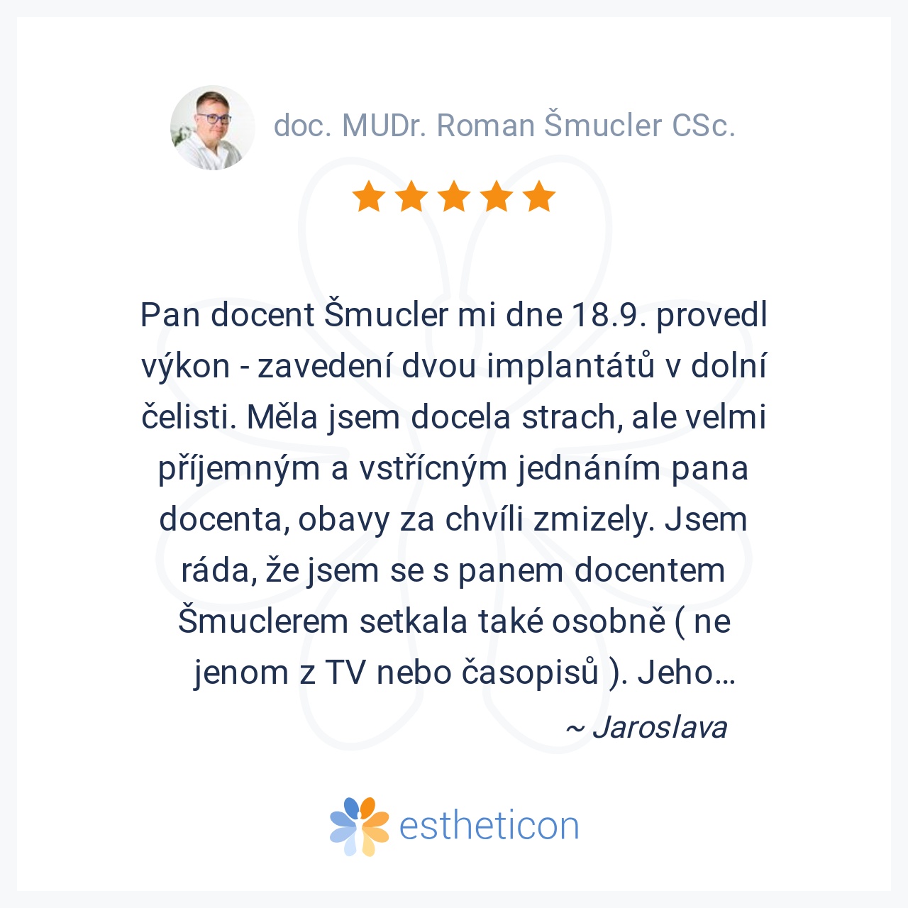 Pan docent Šmucler mi dne 18.9. provedl výkon - zavedení dvou implantátů v dolní čelisti. Měla jsem docela strach, ale velmi příjemným a vstřícným jednáním pana docenta, obavy za chvíli zmizely. Jsem ráda, že jsem se s p... Více