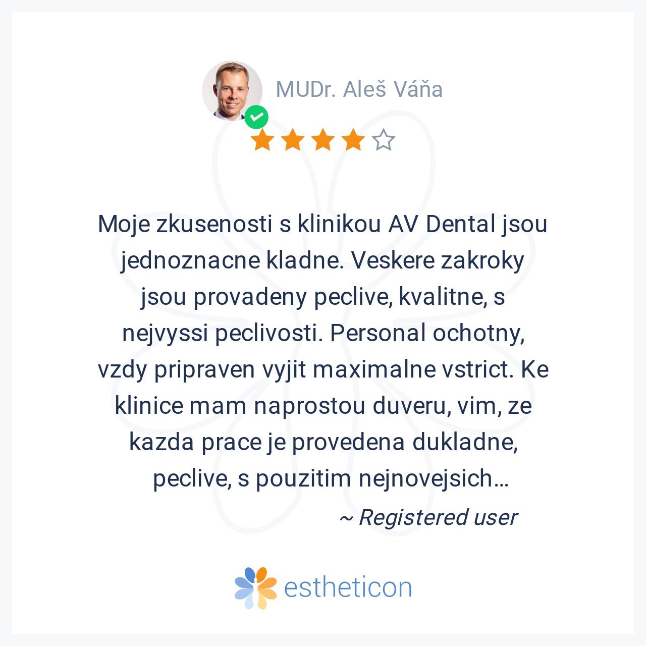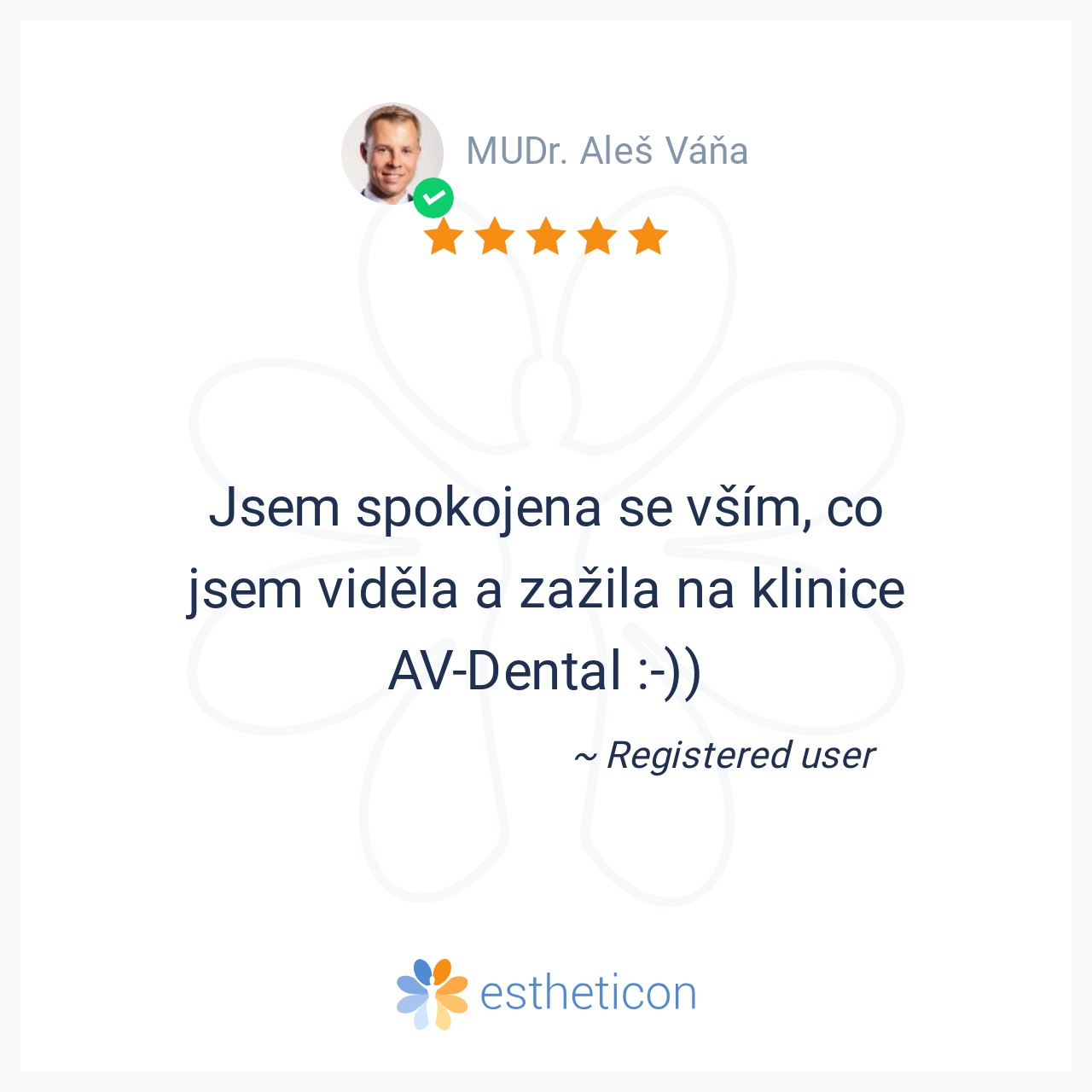 Moje zkusenosti s klinikou AV Dental jsou jednoznacne kladne. Veskere zakroky jsou provadeny peclive, kvalitne, s nejvyssi peclivosti. Personal ochotny, vzdy pripraven vyjit maximalne vstrict. Ke klinice mam naprostou du... Více
