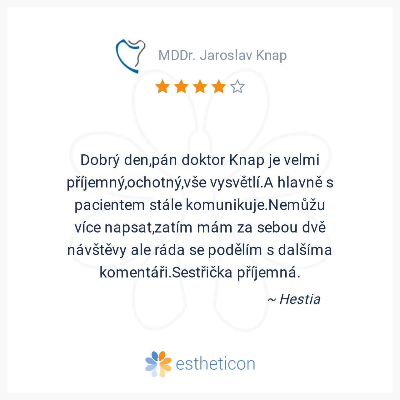 Dobrý den,pán doktor Knap je velmi příjemný,ochotný,vše vysvětlí.A hlavně s pacientem stále komunikuje.Nemůžu více napsat,zatím mám za sebou dvě návštěvy ale ráda se podělím s dalšíma komentáři.Sestřička příjemná.