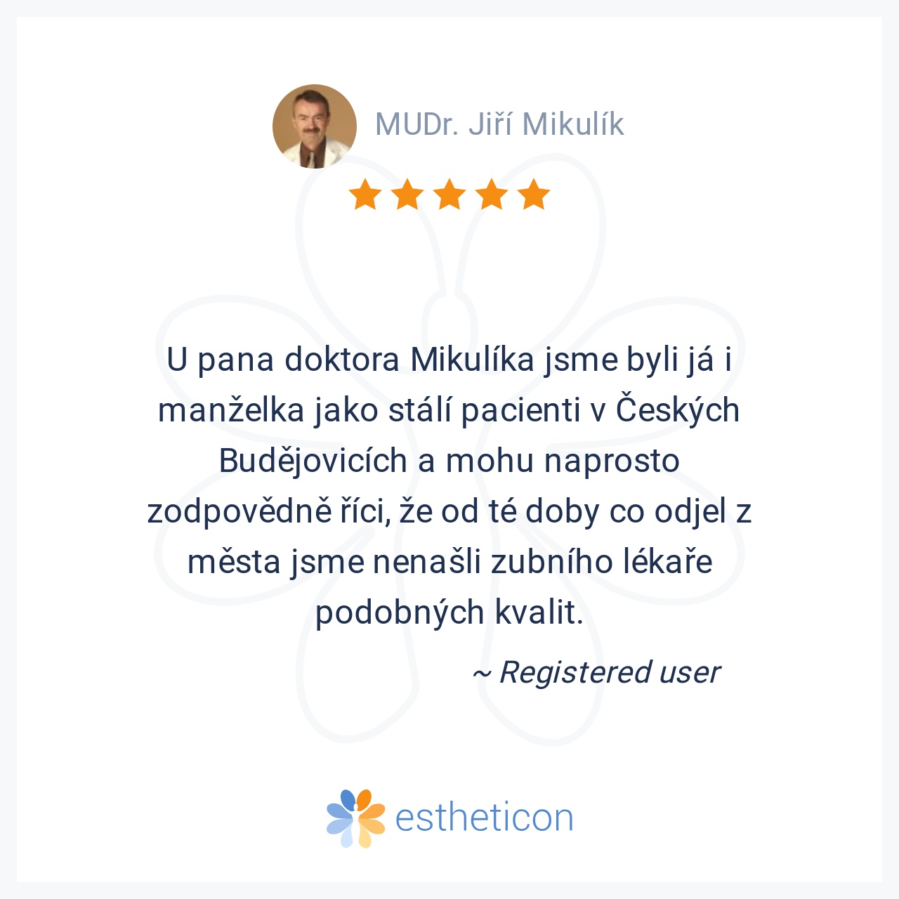 U pana doktora Mikulíka jsme byli já i manželka jako stálí pacienti v Českých Budějovicích a mohu naprosto zodpovědně říci, že od té doby co odjel z města jsme nenašli zubního lékaře podobných kvalit.
