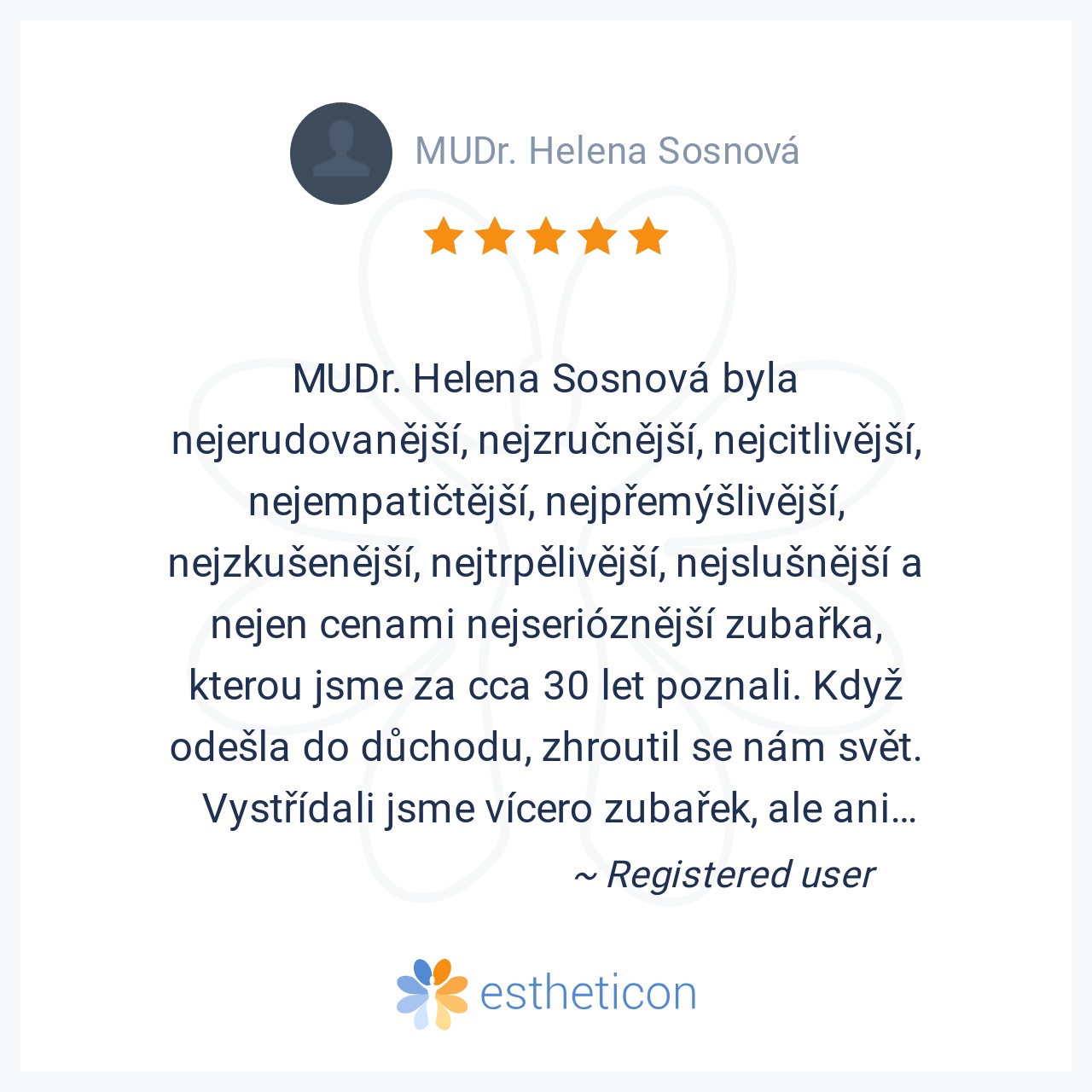 MUDr. Helena Sosnová byla nejerudovanější, nejzručnější, nejcitlivější, nejempatičtější, nejpřemýšlivější, nejzkušenější, nejtrpělivější, nejslušnější a nejen cenami nejserióznější zubařka, kterou jsme za cca 30 let pozn... Více