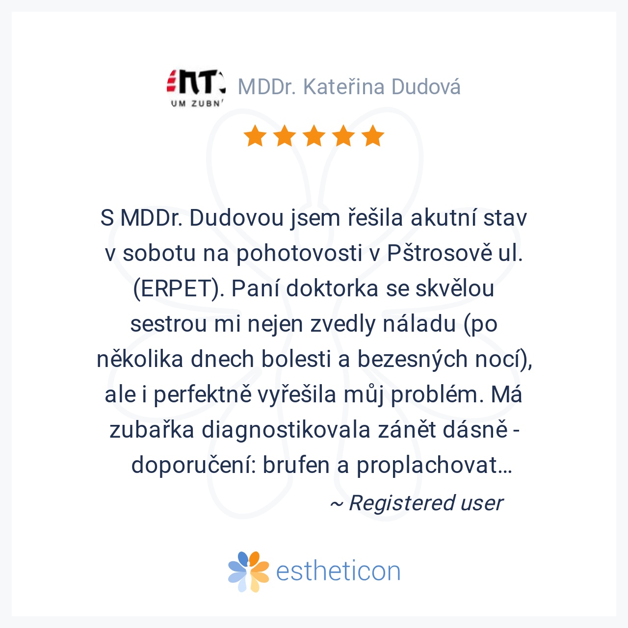 S MDDr. Dudovou jsem řešila akutní stav v sobotu na pohotovosti v Pštrosově ul. (ERPET). Paní doktorka se skvělou sestrou mi nejen zvedly náladu (po několika dnech bolesti a bezesných nocí), ale i perfektně vyřešila můj ... Více