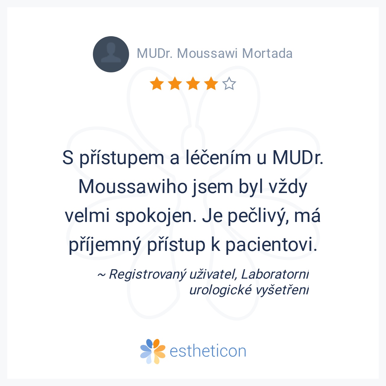 S přístupem a léčením u MUDr. Moussawiho jsem byl vždy velmi spokojen. Je pečlivý, má příjemný přístup k pacientovi.