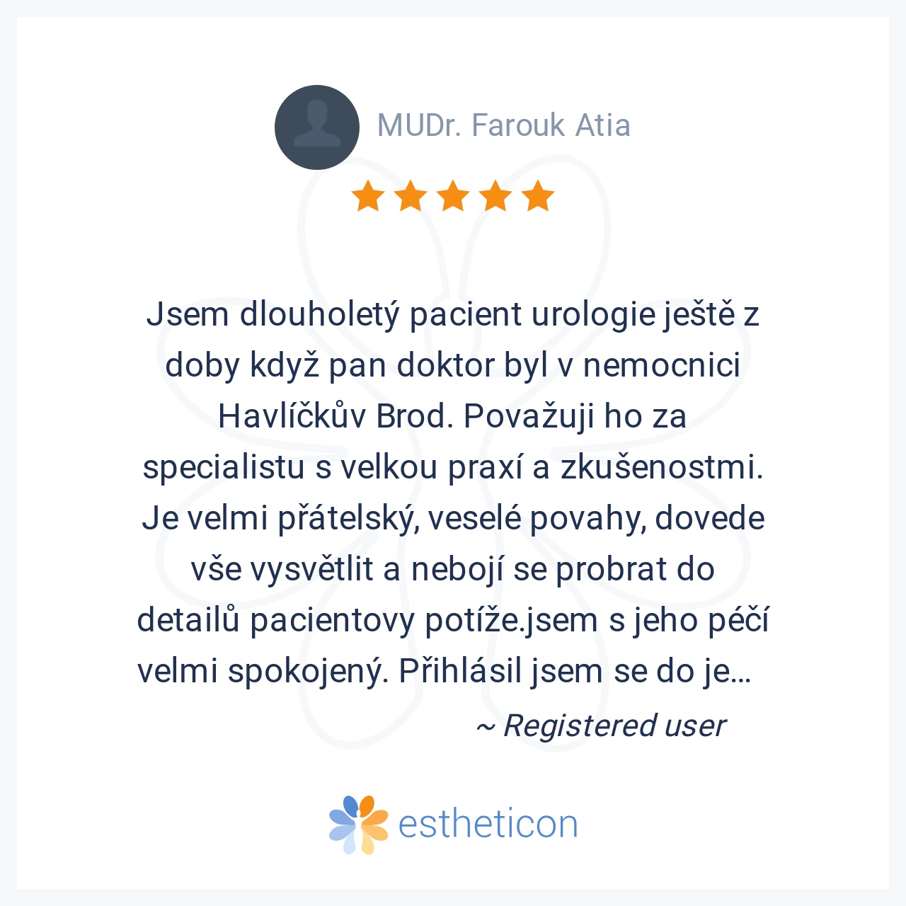 Jsem dlouholetý pacient urologie ještě z doby když pan doktor byl v nemocnici Havlíčkův Brod. Považuji ho za specialistu s velkou praxí a zkušenostmi. Je velmi přátelský, veselé povahy, dovede vše vysvětlit a nebojí se p... Více